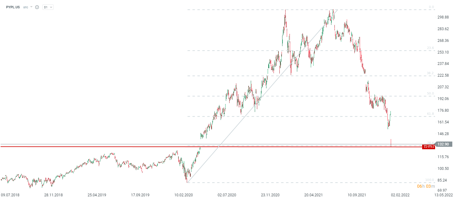 PayPal está perdiendo un 25 % hoy, pero en los últimos meses, las acciones de la compañía han limitado alrededor del 80 % del impulso alcista que comenzó después de que la pandemia golpeó por primera vez. Las caídas de hoy se han visto frenadas por el límite inferior del gap alcista de mayo de 2020. Fuente: xStation 5