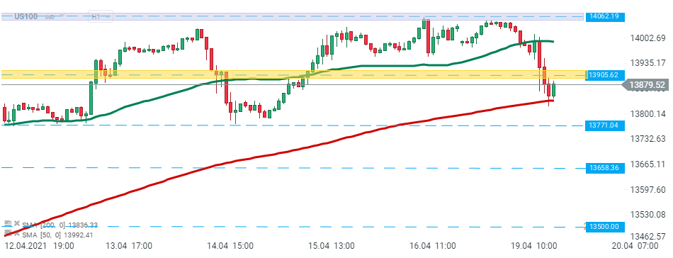 US100 retrocedió desde máximos históricos en 14.062 pts y rompió por debajo del soporte principal en 13.905. Por el momento, 200 SMA (línea roja) logró detener las caídas, al menos temporalmente. Fuente: xStation5