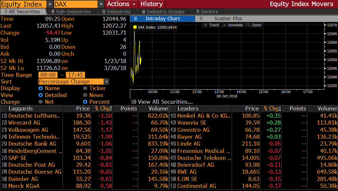 Los mercados de valores europeos abrieron a la baja al comienzo de la nueva semana luego de que se observaron fuertes descensos en Asia. La mayor venta masiva se registró en el mercado bursátil italiano después de que Luigi Di Maio rechazó los ataques de la Comisión Europea al déficit presupuestario planificado. Por otro lado, se observaron pequeñas ganancias entre las acciones rusas. Los fabricantes de automóviles europeos fueron los que tuvieron un peor desempeño en los primeros minutos de intercambio, mientras que los sub-índices de viajes y medios de comunicación del índice Euro Stoxx 600 fueron los únicos que publicaron ganancias después de la apertura.