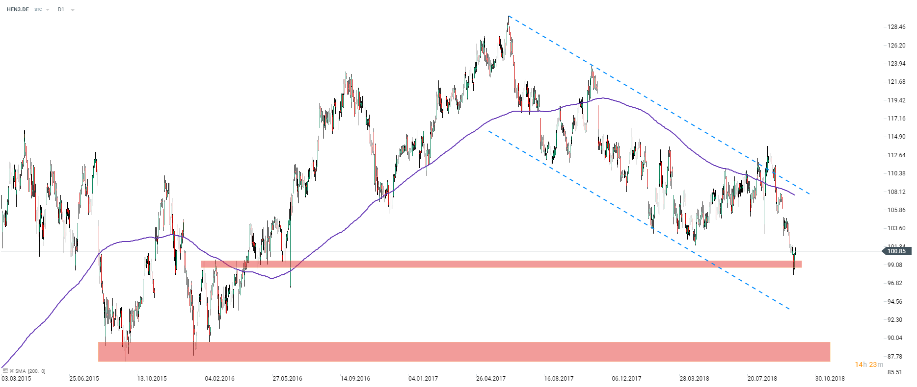 Henkel (HEN3.DE) logró rebotar más alto en las cercanías de la zona de soporte que oscila entre € 98.90-99.70. Sin embargo, las acciones aún se negocian dentro del canal descendente y, a menos que logre romper por encima del límite superior del canal, se puede producir un período prolongado de caídas. En tal caso, los operadores deben mantenerse en guardia cerca del soporte de los 88 €, ya que el precio se revirtió un par de veces en los últimos tres años sobre este nivel. Fuente: xStation