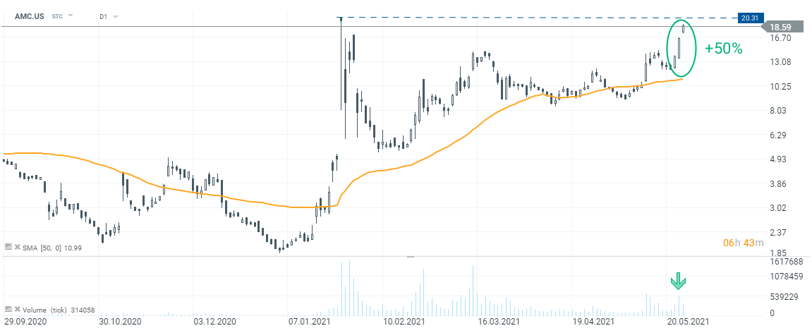 ¡Las acciones de AMC Entertainment (AMC.US) se han recuperado alrededor del 50% desde el lunes! En este caso, el precio está realmente muy cerca de los máximos históricos intradiarios de enero que pueden encontrarse ligeramente por encima del nivel de 20 dólares. Tanto AMC como GameStop han experimentado un rápido aumento de volumen. Cabe señalar que ambos gráficos se ven sesgados debido a los increíbles movimientos de precios a principios de este año. Fuente: xStation5