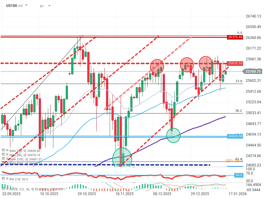 El mercado se aproxima a un momento clave, en el que deberá decidir si logra superar la zona de resistencia en 25.900 puntos. Si los compradores no consiguen romper este nivel por cuarta vez consecutiva, la oferta podría tomar la iniciativa y llevar el precio hacia la zona de retroceso de Fibonacci del 38,2%.