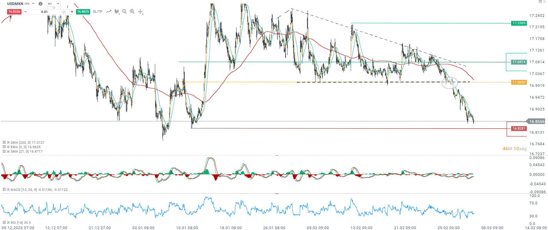 El tipo de cambio del peso mexicano reaccionó favorablemente ante los recientes datos de inflación, que mostraron un incremento mensual, pero un descenso interanual hacia el 4.4%. Como resultado, el tipo de cambio se redujo a 16.8558, rompiendo la tendencia de un triángulo descendente y posicionando el precio actual por debajo de las medias móviles. Este comportamiento podría sugerir que el impulso bajista aún no ha concluido.