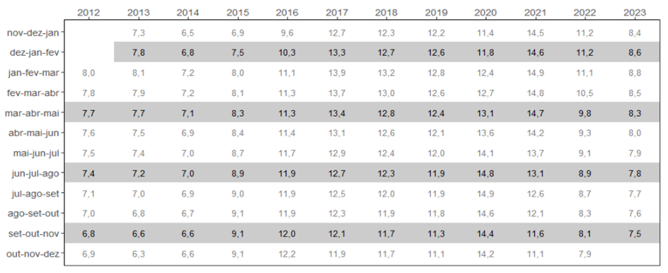 En el trimestre finalizado en noviembre de 2023, la tasa de desempleo en Brasil se situó en el 7,5%, lo que representa una disminución de 0,2 puntos porcentuales (pp) respecto al trimestre anterior y de 0,5 pp en comparación con el mismo trimestre de 2022. Esta es la tasa de desempleo más baja desde febrero de 2015.
