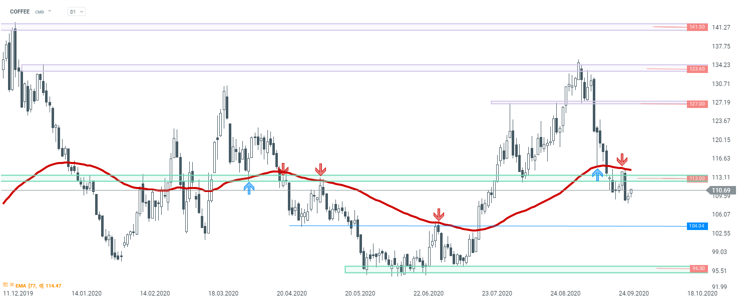 Anteriormente, el precio del café había reaccionado a su SMA77. Siempre que el precio se mantenga por debajo de él, seguirán siendo posibles nuevas caídas hacia $ 104. Por otro lado, una ruptura brusca por encima del nivel de $ 113 podría allanar el camino para un movimiento ascendente más grande hacia $ 127. Fuente: xStation5