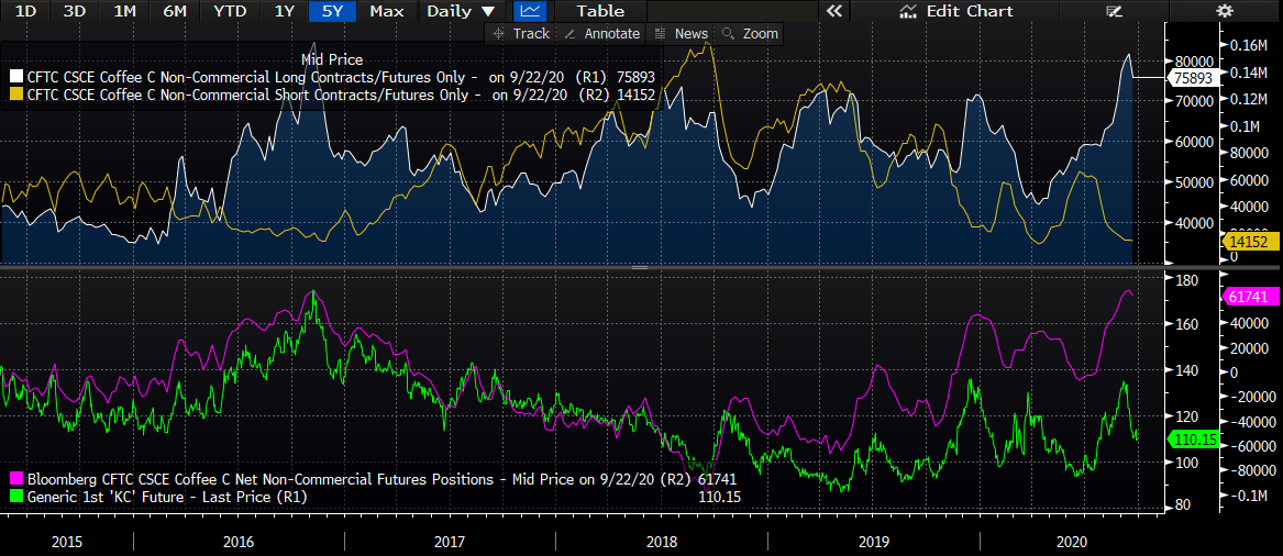 Disminución del número de posiciones largas en medio de un número récord de posiciones cortas: ambos factores podrían haber contribuido a las caídas de los precios del café en septiembre. Fuente: Bloomberg