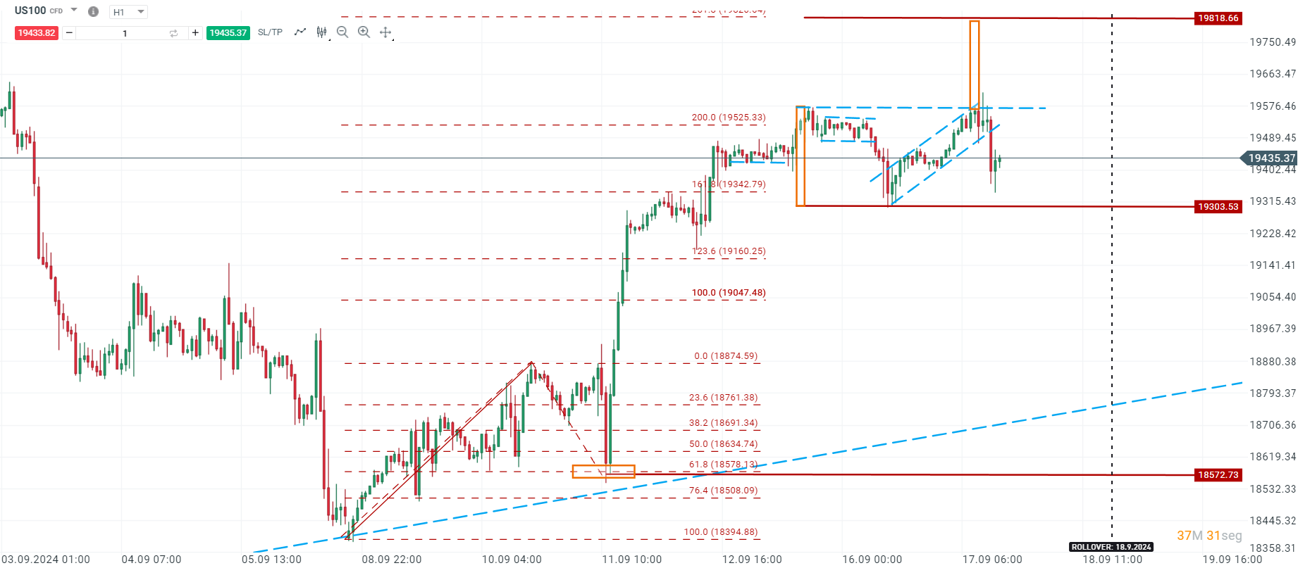 - Si la Fed anuncia un recorte de 50 puntos básicos, el mercado podría reaccionar de manera positiva, rompiendo las resistencias actuales. El nivel de 19525.33 (Fibonacci 200%) es el primer objetivo inmediato a romper, seguido de la resistencia en 19818.66.