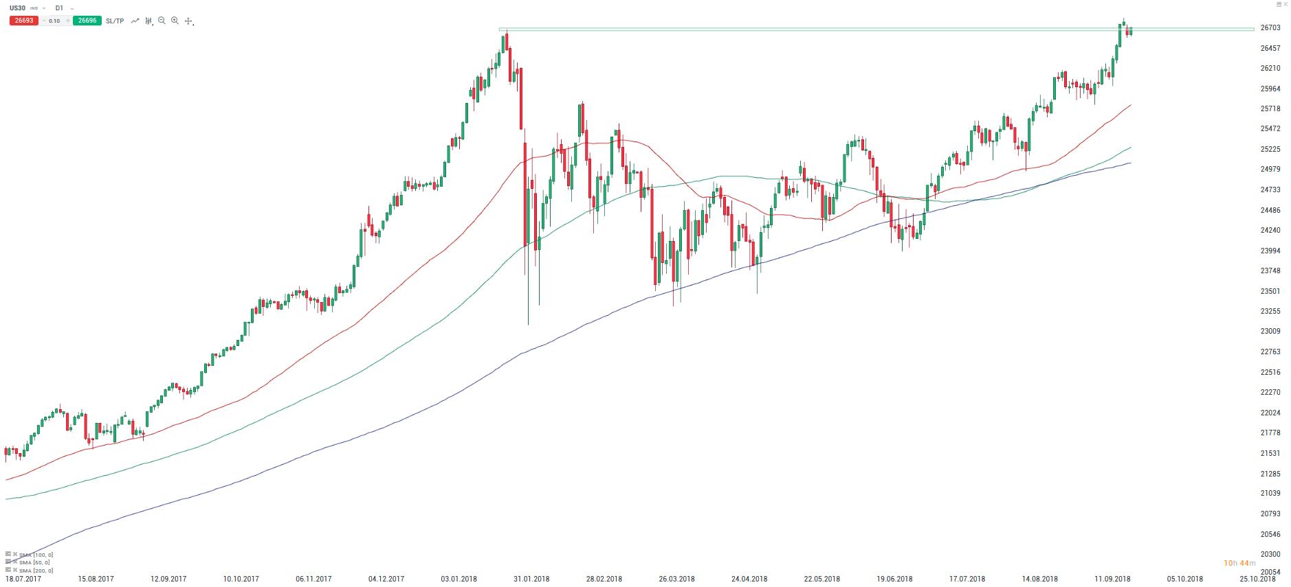 Las acciones americanas han sido increíblemente inmunes a cualquiera de los riesgos presentes en los mercados. La guerra comercial, la crisis de los mercados emergentes, la FED subiendo tipos.. todos estos factores han sido constantemente ignorados por los alcistas de Wall Street. Actualmente el US30 (con los futuros del DJIA30 como subyacentes) ronda los máximos históricos tan solo un día antes de la reunión del FOMC. Aunque el mercado podría estar en cierto sentido sobre comprado, los traders miran las medias móviles para contrastar sus expectativas, especialmente la media móvil de 200 días que actuó de forma similar en el pasado.