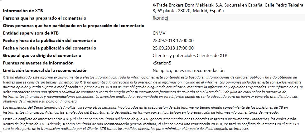 "Este informe se proporciona sólo con fines de información general y con fines educativos. Cualquier opinión, análisis, precio u otro contenido no constituyen asesoramiento de inversión o recomendación en entendimiento de la ley de Belice. El rendimiento en el pasado no indica necesariamente los resultados futuros, y cualquier persona que actúe sobre esta información lo hace bajo su propio riesgo. XTB no aceptará responsabilidad por ninguna pérdida o daño, incluida, sin limitación, cualquier pérdida de beneficio, que pueda surgir directa o indirectamente del uso o la confianza de dicha información. Los contratos por diferencias (""CFDs"") son productos con apalancamiento y acarrean un alto nivel de riesgo. Asegúrese de comprender los riesgos asociados. "