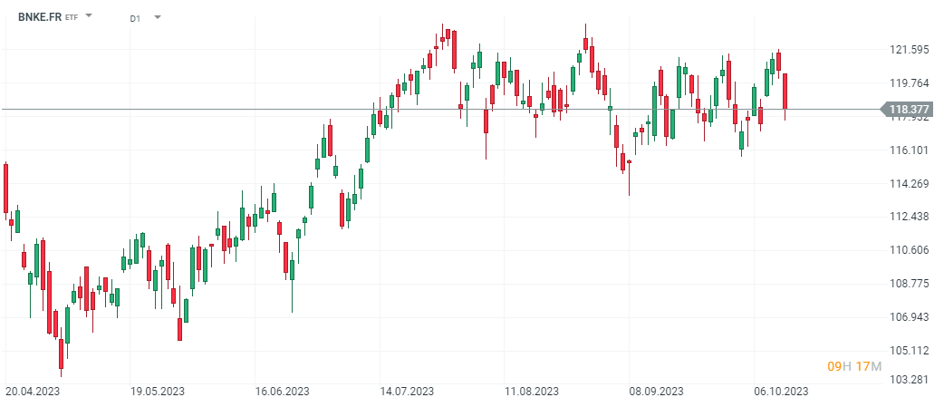 Durante la jornada de hoy, el ETF del sector bancario en Europa, bajo el ticker BNKE.FR, cotiza a la baja aumentando su caída