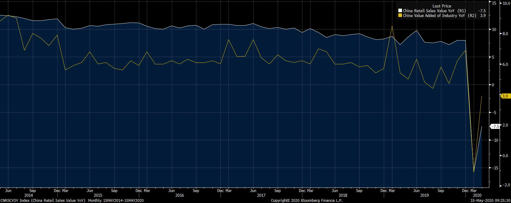 El conjunto mensual de indicadores de China se publicó hoy. Los datos arrojan sombra sobre cualquier expectativa de recuperación en forma de V en las principales economías. La producción industrial aumentó un 3,9% interanual en abril, pero las ventas minoristas registraron una caída del 7,5% interanual. Esto demuestra que poner a las personas de vuelta al trabajo solo requería levantar las restricciones, pero llevar a las personas de vuelta a las tiendas es una historia diferente. El gasto en ropa, joyas, restaurantes y telefonía móvil se redujo significativamente. Los datos de China pueden servir como guía sobre qué esperar una vez que las principales economías como Alemania, Japón o Estados Unidos se reabran por completo. Las inversiones fijas siguen deprimidas y disminuyeron 10.3% respecto al año anterior. Sin embargo, la cifra fue ignorada en gran medida por los mercados. Incluso el cobre, barómetro para el crecimiento global, se cotiza al alza hoy.