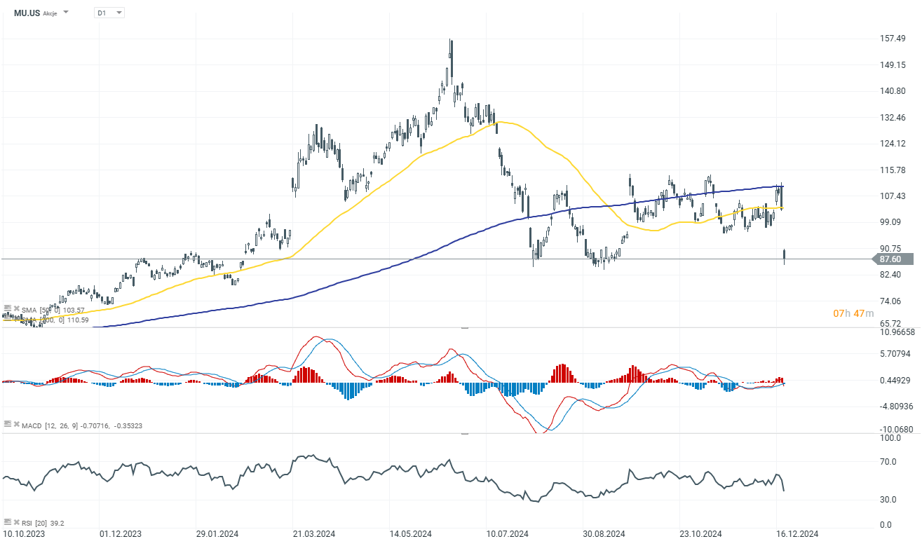 Micron Technology (MU.US) cae un 15 % debido a las débiles previsiones para el segundo trimestre, con unas ganancias (1,33 $–1,53 $/acción) y unos ingresos (7700 $–8100 millones de dólares) por debajo del consenso, a pesar del optimismo por el crecimiento impulsado por la IA.