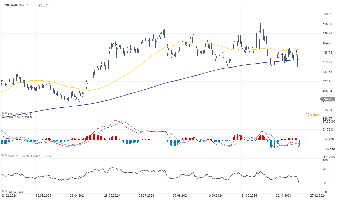 Vertex Pharmaceuticals (VRTX.US) cayó un 11,85% después de que los resultados de los ensayos de su analgésico suzetrigina mostraran una eficacia similar al placebo (-1,98 frente a -2,02), lo que generó inquietud a pesar de los planes para realizar ensayos fundamentales.