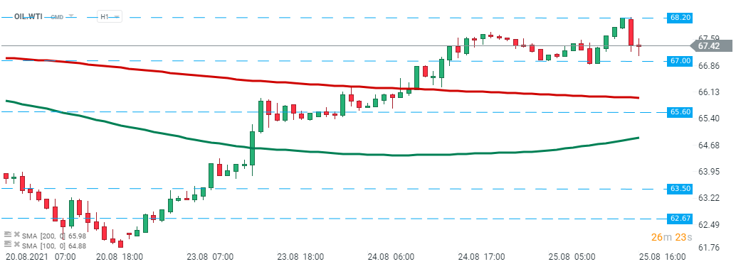 La publicación del informe de ayer no tuvo un impacto significativo en los precios del petróleo. El petróleo WTI (OIL.WTI) continúa operando por encima del soporte local en $ 67,00. Fuente: xStation5