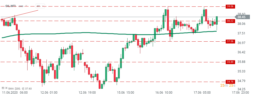 El precio del petróleo crudo WTI (OIL.WTI) aumentó después de la publicación del informe de la EIA de hoy y se dirige hacia el nivel de resistencia de $39.06. Fuente: xStation5