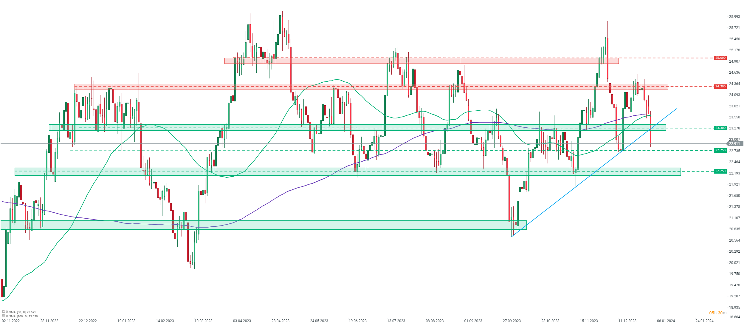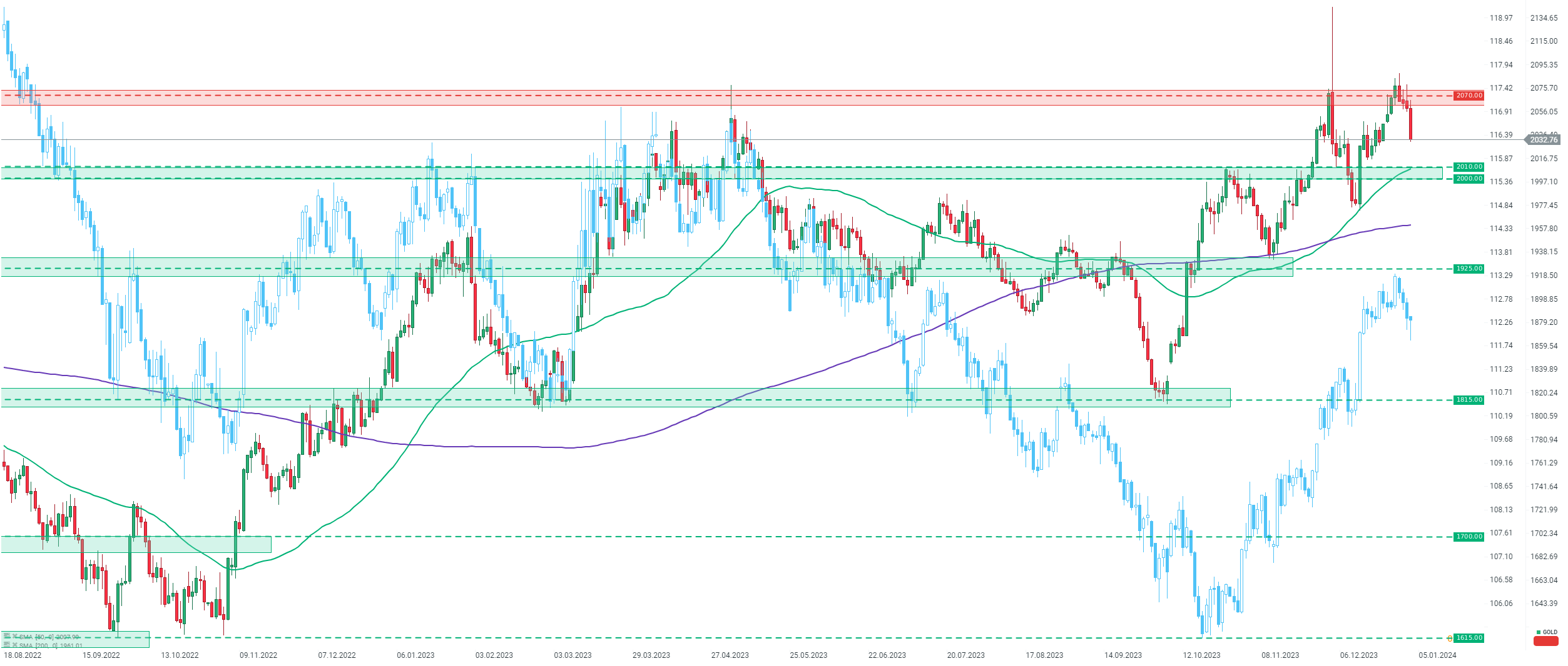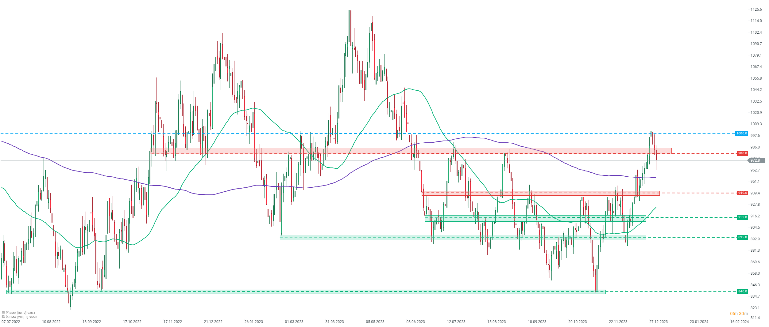 EL Platino superó la marca de los 1.000 dólares por onza el 28 de diciembre de 2023, por primera vez desde la primera quincena de junio de 2023. Sin embargo, los alcistas no lograron mantener este nivel y el precio volvió a caer por debajo de él al día siguiente. El Platino se movió hoy por debajo de la zona de precios de $ 980 por onza. El siguiente soporte importante a tener en cuenta se puede encontrar en el área de $ 940 por onza, pero los bajistas necesitarían superar primero el promedio móvil de 200 periodos (línea púrpura). Fuente: xStation5