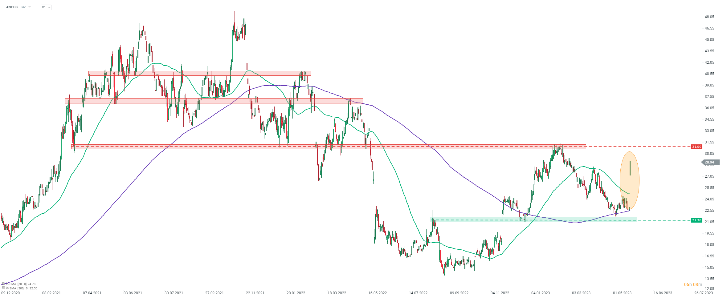 Abercrombie & Fitch (ANF.US) saltó al comienzo de la sesión de negociación en efectivo en Wall Street y extendió esas ganancias más tarde durante la jornada. Las acciones se están negociando en el nivel más alto desde principios de marzo de 2023. La zona de resistencia más cercana a tener en cuenta se encuentra en el área de $31.00. Fuente: xStation5.
