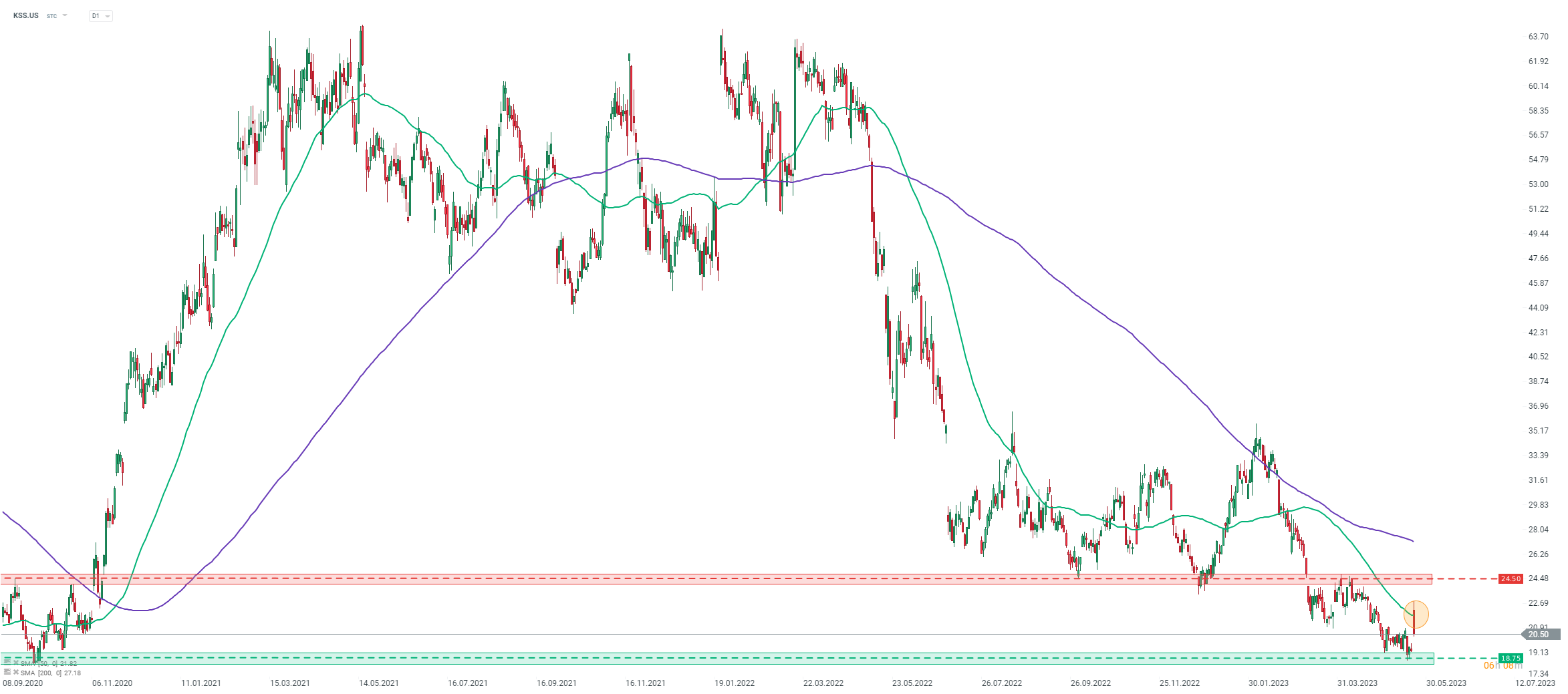 Kohl's (KSS.US) también inició la jornada con una gran brecha alcista en el precio, pero a diferencia de Abercrombie y Urban Outfitters, ha revertido la mayoría de las subidas. La acción comenzó a caer después de no poder superar la media móvil de 50 sesiones (línea verde). Fuente: xStation5.