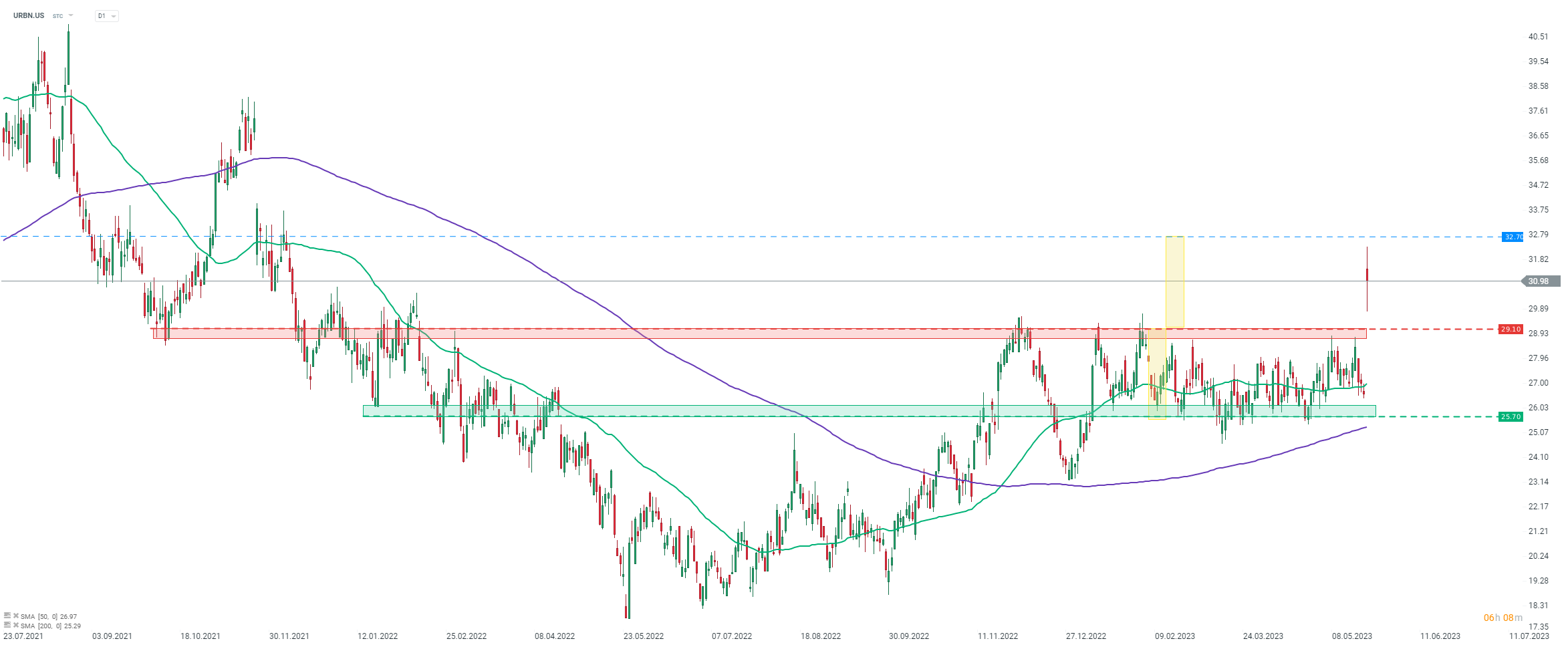 Urban Outfitters (URBN.US) inició la sesión de hoy con una gran brecha alcista en el precio y rompió por encima del rango de negociación reciente de $25.70-29.10 como resultado. Sin embargo, el movimiento al alza se detuvo antes de alcanzar el nivel objetivo de ruptura al alza del rango ($32.70) según lo indicado en los análisis técnicos. Fuente: xStation5.