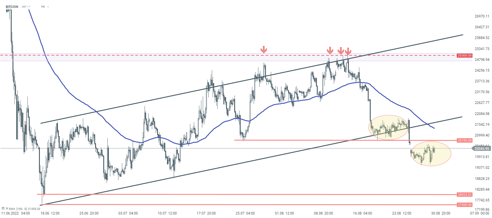 Bitcoin permanece en una tendencia bajista a largo plazo. Mirando técnicamente el gráfico de la principal criptomoneda en el intervalo H4, la acción claramente está luchando por generar un movimiento correctivo más grande. El reciente rebote de la zona de resistencia en $25,000 se tradujo en un movimiento dinámico a la baja, luego de lo cual la criptomoneda abandonó el canal ascendente local. Por lo tanto, parece haber una posibilidad de que continúe el movimiento hacia el sur. Si se realiza tal escenario, el nivel de $ 18,000 debe considerarse como un objetivo potencial para los vendedores. Por otro lado, en caso de un intento de alza, actualmente el nivel de $20,730 debería tomarse como resistencia clave en el corto plazo.