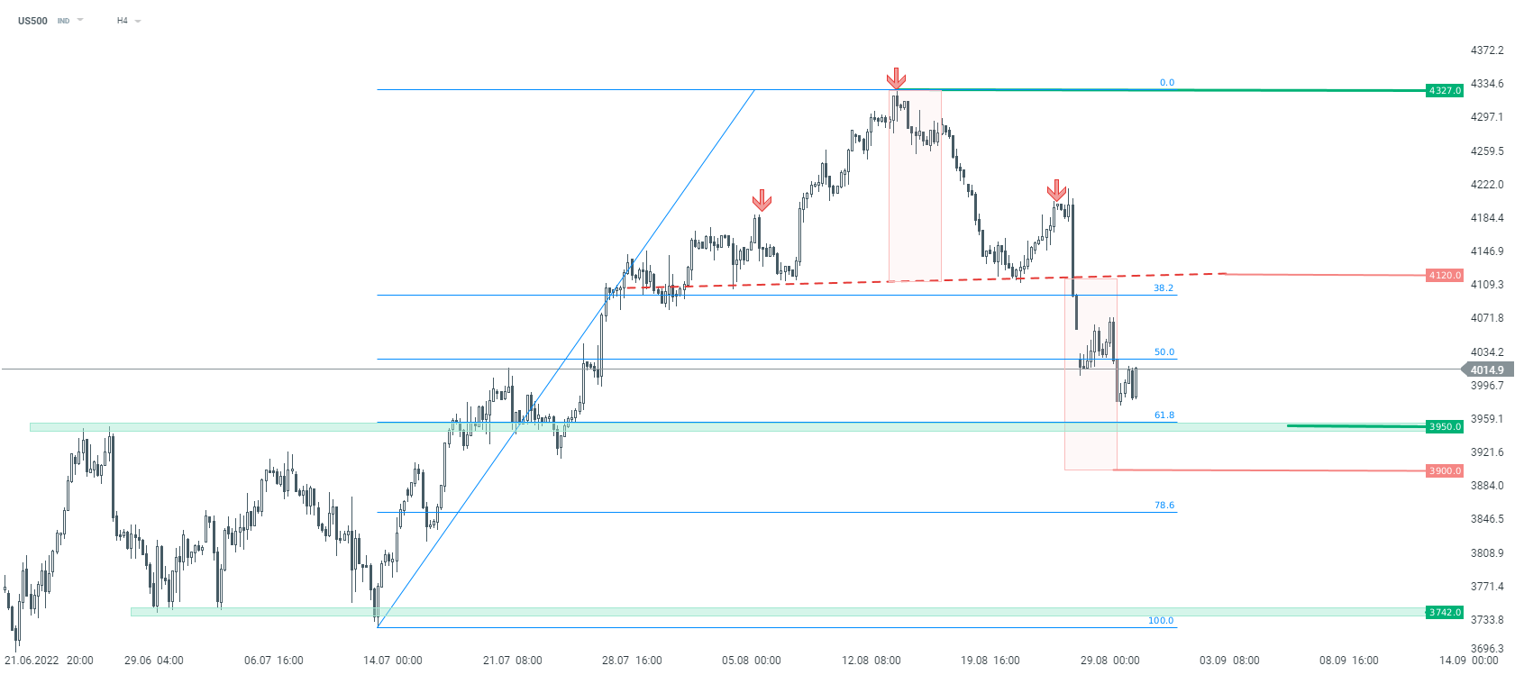 A pesar del intento de rebote observado durante la sesión de hoy, las cotizaciones del índice bursátil continúan bajo presión de venta. Mirando técnicamente a la US500 en el intervalo H4, las cotizaciones están bajo la influencia de una amplia formación de cabeza y hombros. Parece que mientras el precio se mantenga por debajo del escote de dicha formación (línea de puntos roja), existe la posibilidad de realizar el rango de modelo de la estructura: el nivel de 3900 puntos. Antes de eso, también se debe prestar atención al soporte ubicado un poco más arriba, en 3950 puntos. La zona marcada en verde es el resultado de reacciones de precios anteriores y mide 61,8%, que se determinó en la última onda alcista.