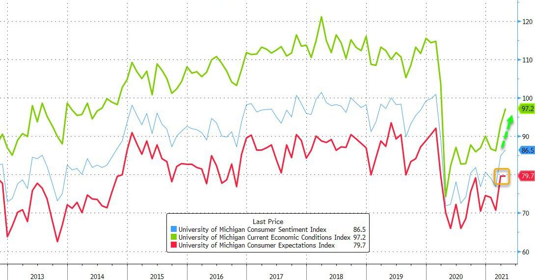 La confianza del consumidor de la Universidad de Michigan en Estados Unidos subió a 86,5 en abril, desde 84,9 en marzo; sin embargo, la lectura del viernes estuvo por debajo de las estimaciones de los analistas de 89,6, mostró una estimación preliminar. Es la lectura más alta desde marzo de 2020, pero a pesar de las ganancias significativas registradas durante los últimos dos meses y la distribución de controles de estímulo, la medida ha recuperado solo una parte del terreno perdido y aún está lejos del nivel prepandémico de febrero de 2020 de 101,0. La evaluación de los consumidores de las condiciones económicas actuales aumentó a 97,2 en abril desde 93,0 en marzo. El índice de expectativas de los consumidores, que refleja el saldo de los encuestados que anticipan mejores condiciones comerciales en los próximos seis meses, se mantuvo sin cambios en 79,7.