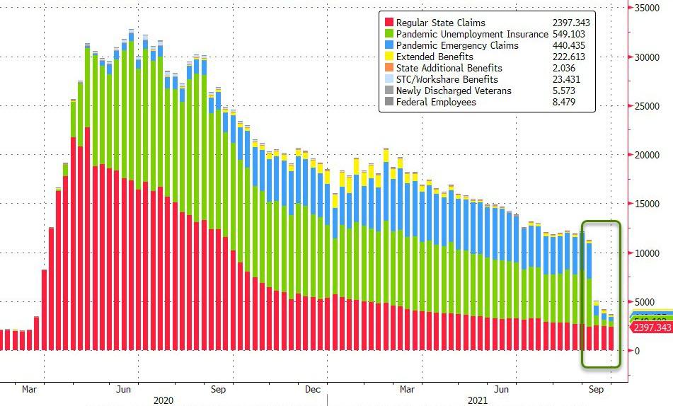 Las solicitudes semanales de desempleo cayeron bruscamente la semana pasada al nivel más bajo desde que comenzó la pandemia. Fuente: Bloomberg a través de ZeroHedge