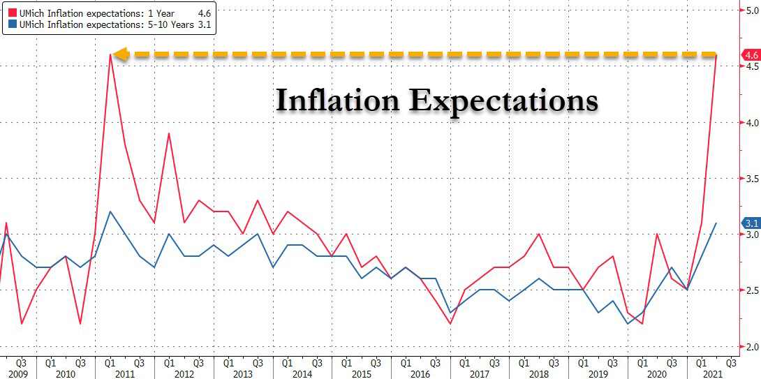 Las expectativas de inflación se elevaron al 4,6%, el nivel más alto en una década. Fuente: Bloomberg a través de ZeroHedge