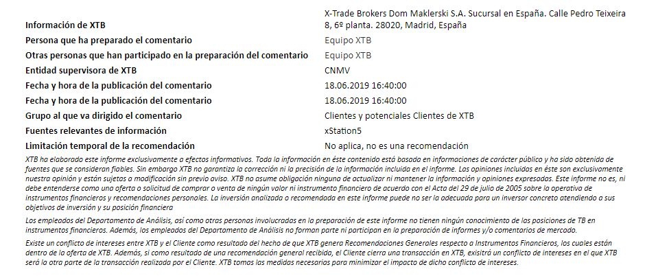 "Este informe se proporciona sólo con fines de información general y con fines educativos. Cualquier opinión, análisis, precio u otro contenido no constituyen asesoramiento de inversión o recomendación en entendimiento de la ley de Belice. El rendimiento en el pasado no indica necesariamente los resultados futuros, y cualquier persona que actúe sobre esta información lo hace bajo su propio riesgo. XTB no aceptará responsabilidad por ninguna pérdida o daño, incluida, sin limitación, cualquier pérdida de beneficio, que pueda surgir directa o indirectamente del uso o la confianza de dicha información. Los contratos por diferencias (""CFDs"") son productos con apalancamiento y acarrean un alto nivel de riesgo. Asegúrese de comprender los riesgos asociados. "