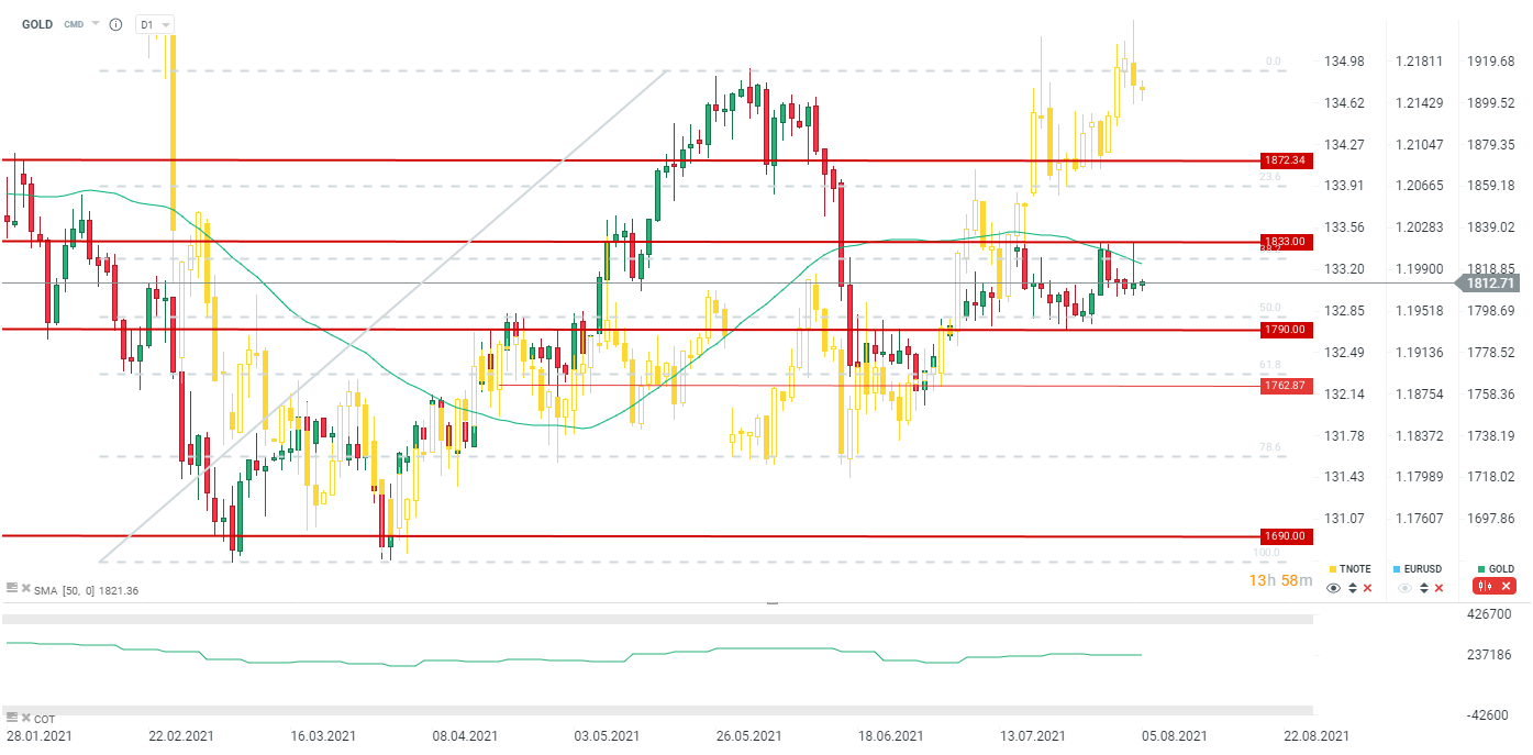 El precio del oro permanece dentro del rango de consolidación en 1800-1830 USD/onza. Actualmente, el oro cotiza bajo la media móvil a 50 sesiones y el nivel 38.2% del retroceso de Fibonacci. La zona de demanda se está fortaleciendo. A corto plazo, el USD podría tener el impacto más notable sobre el mercado del oro. Fuente: xStation5