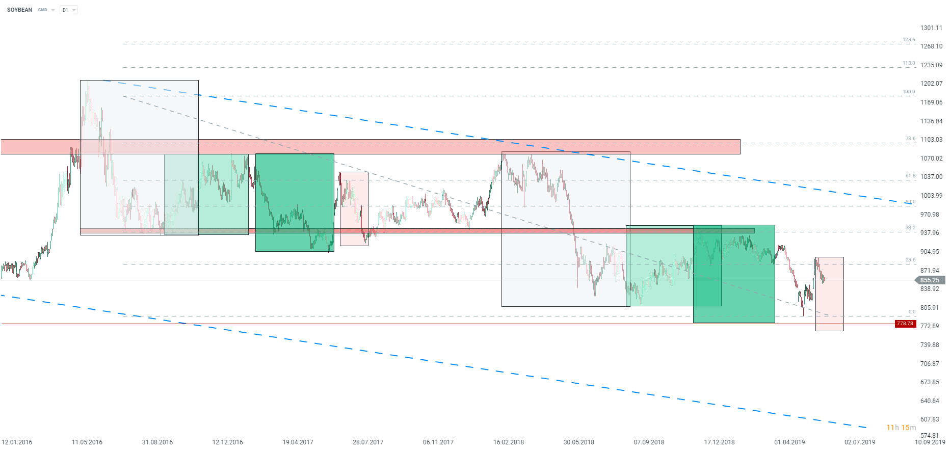 Los precios de la soja no recibieron apoyo del lanzamiento de WASDE ayer. La batalla comercial entre Estados Unidos y China debería limitar el potencial ascendente de los precios. Fuente: xStation5