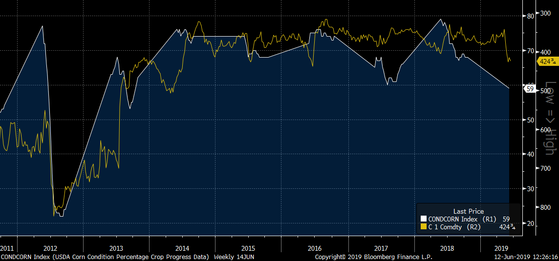 La calidad de la cosecha de maíz es la más débil desde 2013. Fuente: Bloomberg