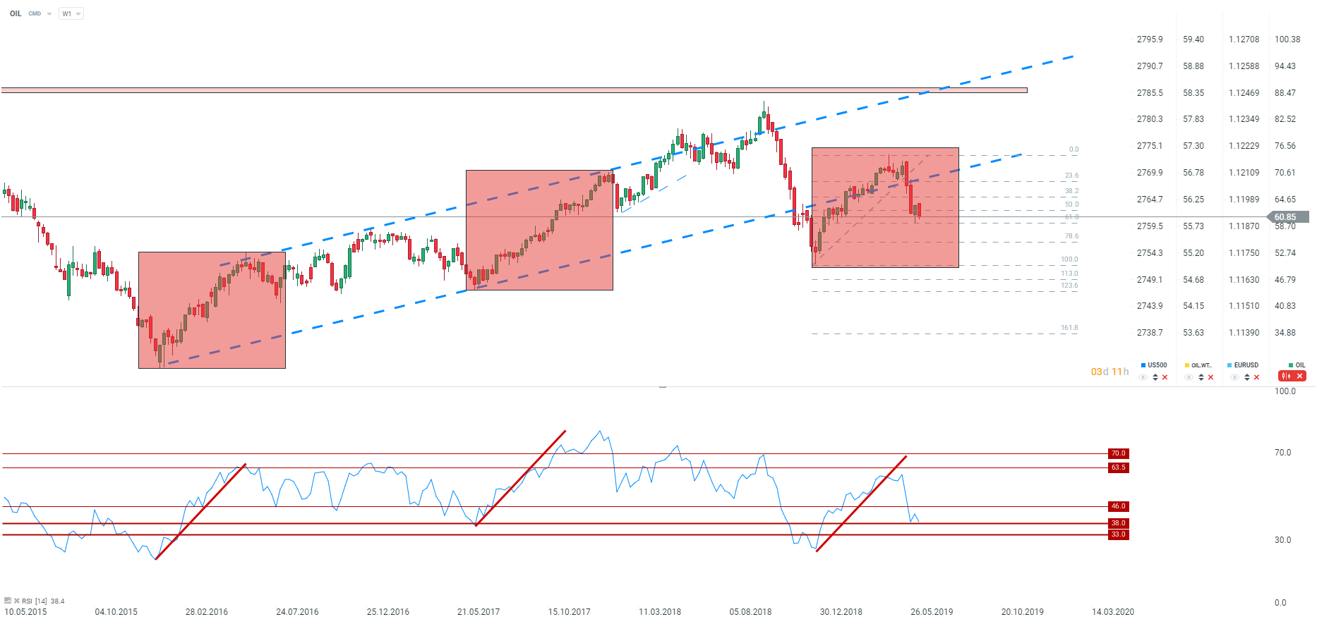 Los precios del petróleo siguen disminuyendo debido a las preocupaciones sobre el crecimiento económico mundial. El escenario base puede hacer que el precio caiga a $ 55 o menos. Fuente: xStation5
