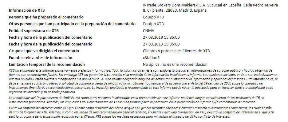 "Este informe se proporciona sólo con fines de información general y con fines educativos. Cualquier opinión, análisis, precio u otro contenido no constituyen asesoramiento de inversión o recomendación en entendimiento de la ley de Belice. El rendimiento en el pasado no indica necesariamente los resultados futuros, y cualquier persona que actúe sobre esta información lo hace bajo su propio riesgo. XTB no aceptará responsabilidad por ninguna pérdida o daño, incluida, sin limitación, cualquier pérdida de beneficio, que pueda surgir directa o indirectamente del uso o la confianza de dicha información. Los contratos por diferencias (""CFDs"") son productos con apalancamiento y acarrean un alto nivel de riesgo. Asegúrese de comprender los riesgos asociados. "
