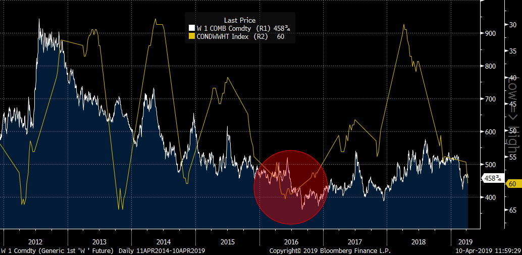 El comienzo de la nueva temporada para los precios del trigo no ha sido bueno cuando tenemos en cuenta algunos datos fundamentales. La situación actual es muy similar a la observada en 2016. Luego, tuvimos los fuertes aumentos en mayo, seguidos por el pico en junio y luego el precio reanudó su tendencia a la baja. Sin embargo, las posibles caídas podrían contenerse en esta ocasión a 420c por bushel. Los precios del trigo podrían tener un mejor rendimiento a fines de mayo-julio, según los patrones estacionales. Fuente: Bloomberg