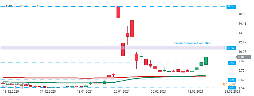 Las acciones de AMC Entertainment (AMC.US) también están subiendo considerablemente. Fuente: xStation5