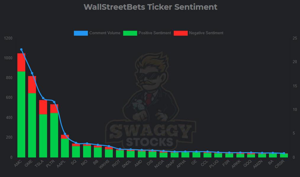 Según Swaggy Stocks, las acciones de AMC y Gamestop volvieron a registrar el mayor volumen de comentarios y sentimiento positivo en WSB. Fuente: Wall Street Bets (a través de ZeroHedge)