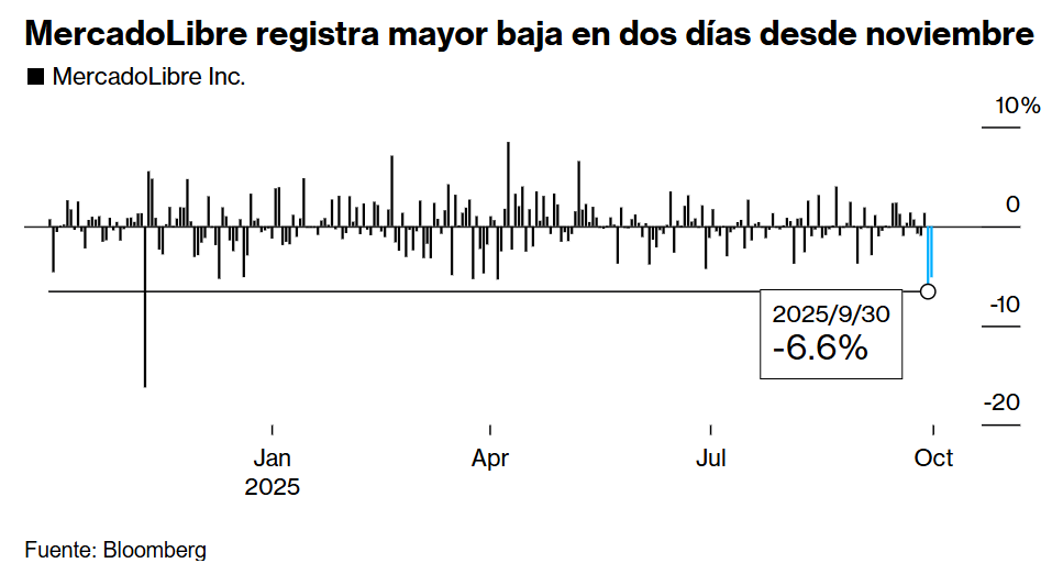 Durante las jornadas del martes y miércoles, el papel de MercadoLibre cayó un 6,6% y llegó a retroceder hasta 5,8% intradía, tocando un mínimo de US$2.222,52, su nivel más bajo desde el 7 de mayo de 2025, según datos de Bloomberg.