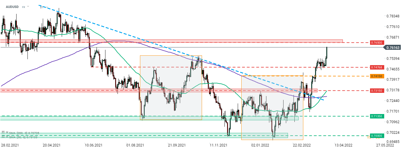 AUDUSD subió hoy después de que se eliminó la mención de paciencia de la declaración de RBA. Esto sugiere que el RBA puede decidir subir las tasas en una de las próximas reuniones. AUDUSD alcanzó el nivel más alto desde junio de 2021 luego de la decisión y mira hacia la zona de resistencia por encima de 0.7650. Fuente: xStation5