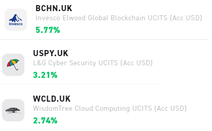 Entre los ETFs que más suben, podemos encontrar como de nuevo el blockchain sale ganador y se anota una fuerte subida de más de un 5%, y ya son varias sesiones consecutivas. Le siguen ETFs relacionados con la informática, en concreto la ciberseguridad y el cloud computing.