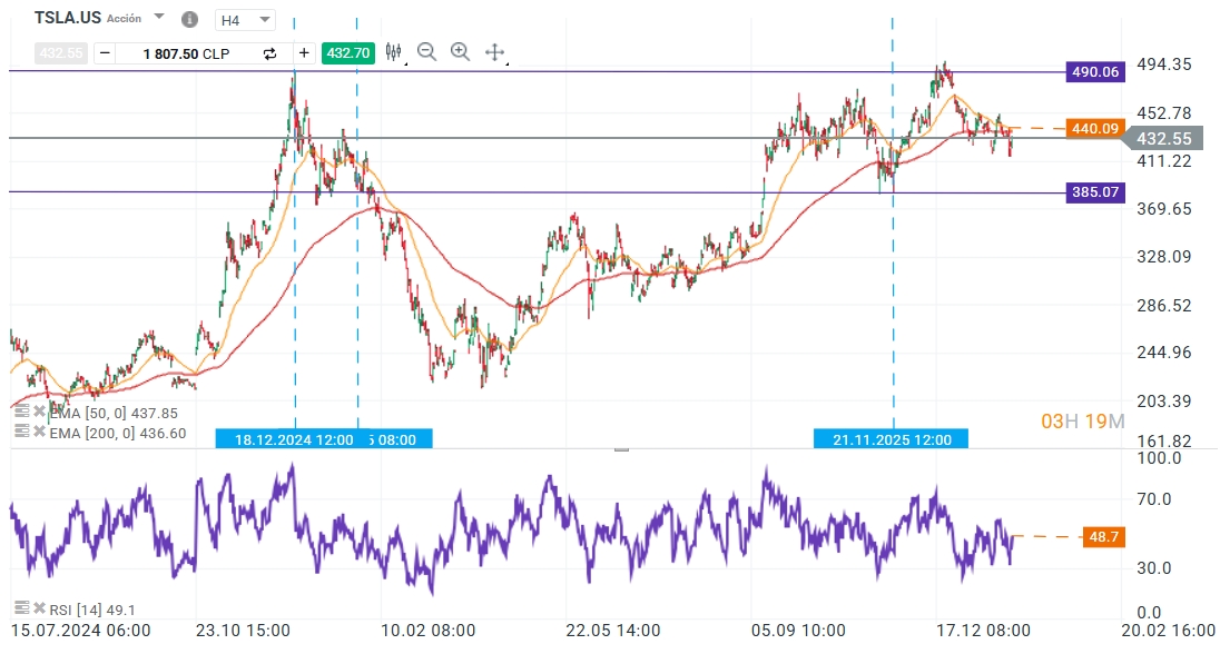La cotización de Tesla oscila actualmente en torno a los US$ 432,55, manteniendo una tendencia alcista que, sin embargo, ha comenzado a mostrar señales de un agotamiento gradual en su fuerza compradora. Esta pérdida de momentum se refleja en un RSI de 48,7 puntos, situándose en una zona neutral que evidencia la falta de impulsos agresivos en la negociación actual.
