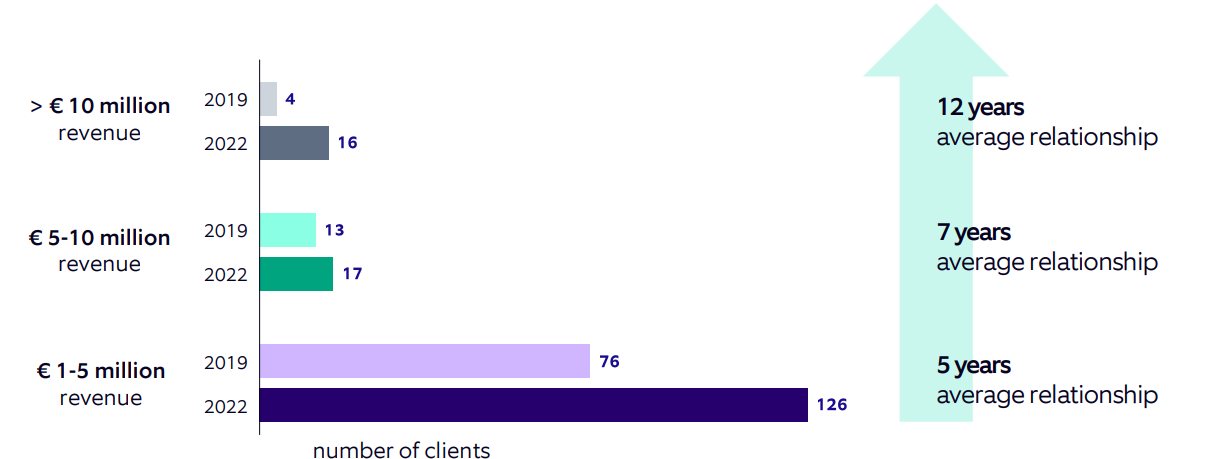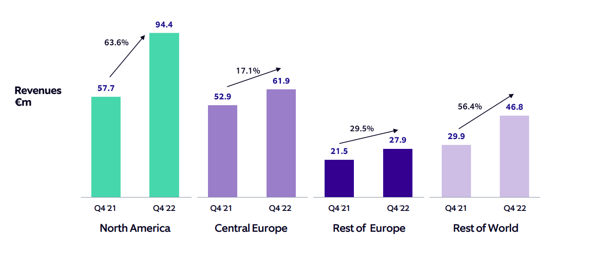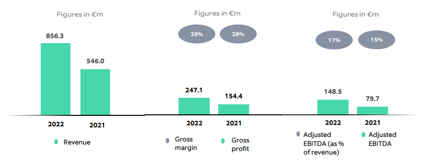 En 2022, tuvo un gran aumento en sus ingresos de €856,3 millones de euros en comparación con el año anterior, un aumento del 56,8%. Los ingresos anuales en moneda extranjera también aumentaron en un 48,0%. Además, la compañía tuvo un crecimiento orgánico constante del 39,3% en sus ingresos.