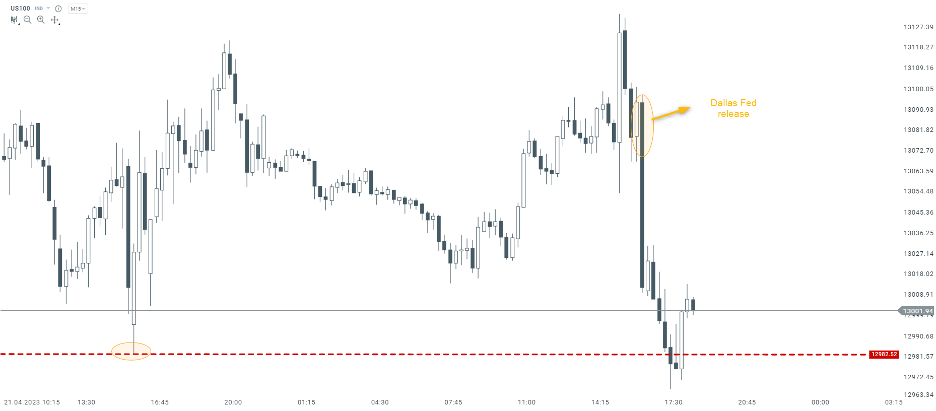 Poco después de la publicación del índice de la Fed de Dallas de abril (sobre el que escribimos a las 17:40 CEST), se observó un retroceso en los principales índices estadounidenses y en los contratos de índices europeos. La lectura de hoy de los datos de actividad regional de EE. UU. mostró una disminución a -23,4 puntos, con expectativas de una disminución a -12 puntos y la lectura anterior a 15,7 puntos, lo que fue un claro desempeño inferior. Esto puede indicar que la economía de EE. UU. está cerca de una recesión, lo que a su vez podría plantear dudas sobre nuevas subidas de tipos de interés por parte de la Reserva Federal.