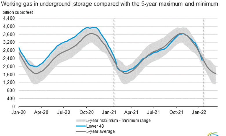 Las existencias de gas caen por debajo del promedio de 5 años. Fuente: EIA