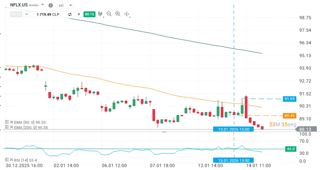 Tras la divulgación no confirmada de que Netflix podría reformular su oferta a una estructura 100% en efectivo, la acción recibió un apoyo táctico por parte de operadores de corto plazo. Se observó un impulso moderado que llevó el precio hacia la zona de US$ 91,04, antes de perder tracción y volver a presionar a la baja, con cotización cerca de US$ 88,13 en el gráfico.