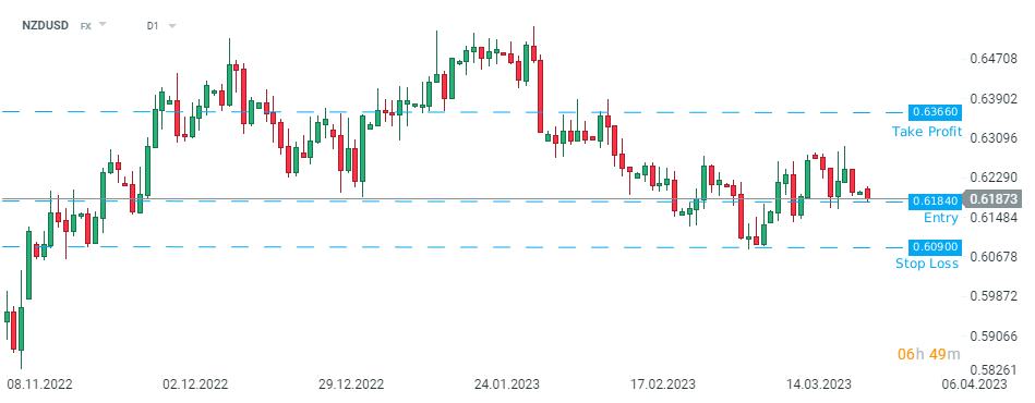 Credit Agricole recomienda tomar una posición larga en NZDUSD en 0,6184 con un objetivo de 0,6366 y una orden de stop loss colocada en 0,6090. Fuente: xStation5
