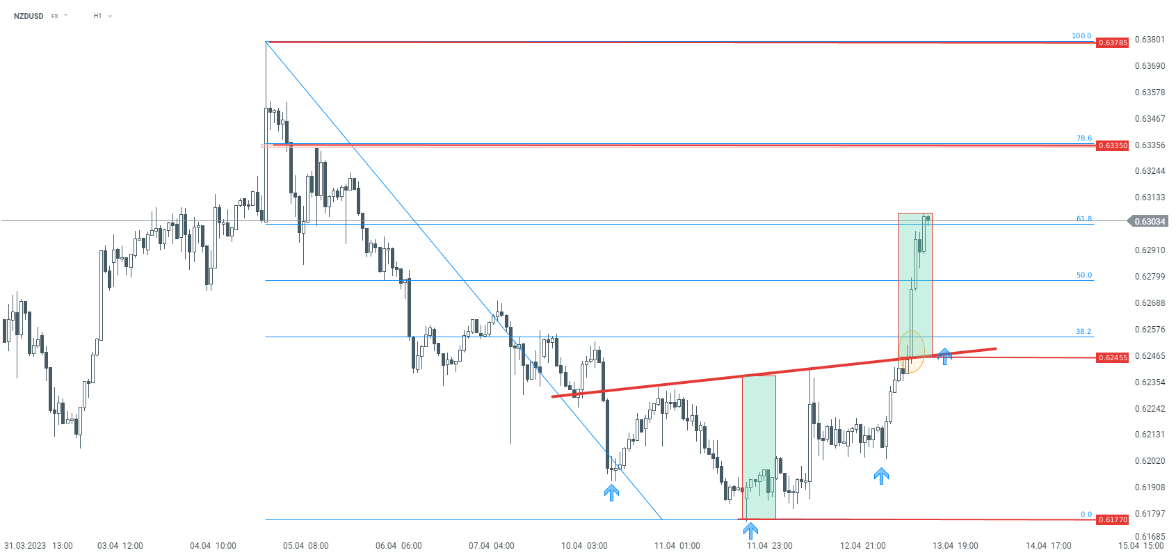 Este tipo de formación de precio suele anunciar una reversión de tendencia, en este caso hacia una tendencia alcista. Después de cruzar el nivel de 0,6455, el movimiento alcista se aceleró y actualmente la acción está luchando con la medición del 61,8% establecida en la última onda descendente. En caso de romper por encima, los toros pueden dirigir su atención hacia la siguiente zona de resistencia en 0,6335. Por otro lado, en caso de una corrección y presión de venta, el soporte se mantiene en el nivel de 0,6245.
