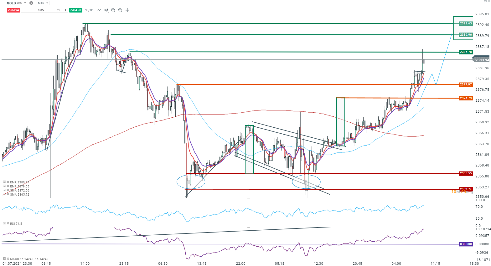En terminos tecnicos el precio del oro busca con bastante fuerza una continuacion de esta presion alcista lo que sugiere objetivos alcistas en los 2385, 2389 y 2392. El precio se encuentra en sobre compra asique los niveles de soporte clave (naranjo) podrian guiar los puntos de giro para la continuacion de la tendencia.