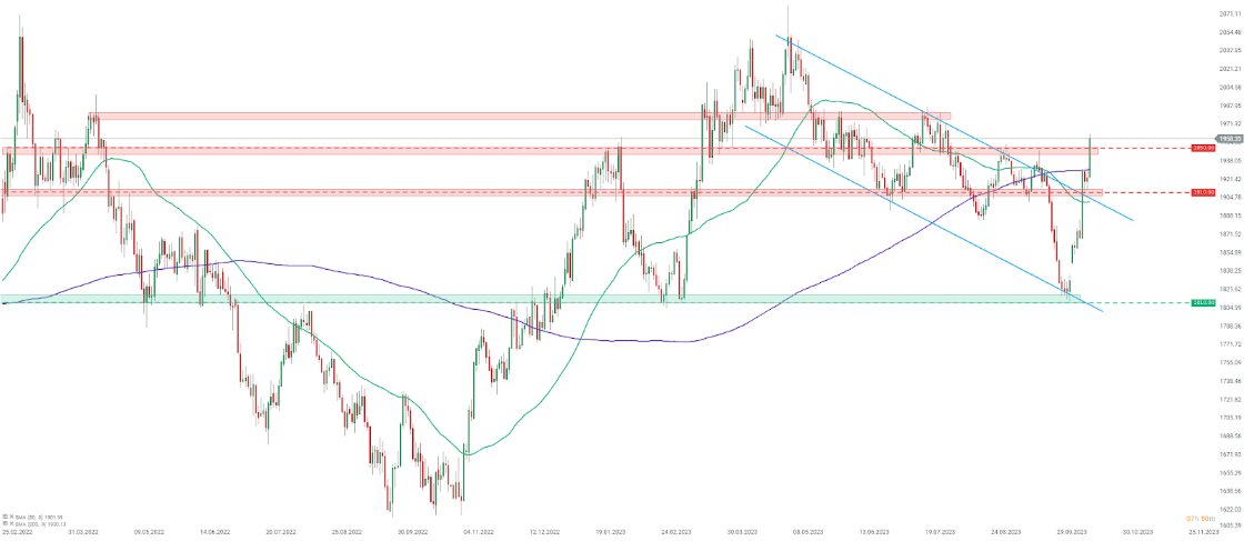 Si observamos el gráfico del oro en el intervalo D1, podemos ver que el metal precioso ha ido en aumento desde que estalló la guerra entre Israel y Hamas hace una semana. El oro rebotó en la zona de soporte de 1.810 $ por onza, que coincidió con el límite inferior del canal bajista, y ha ganado alrededor del 8% desde entonces. El precio supero hoy la media móvil de 200 sesiones (línea morada), así como de la zona de resistencia de 1.950 $ y subió al nivel más alto desde principios de julio y agosto de 2023. También se pueden observar alzas sólidas en la plata (+1,4%).
