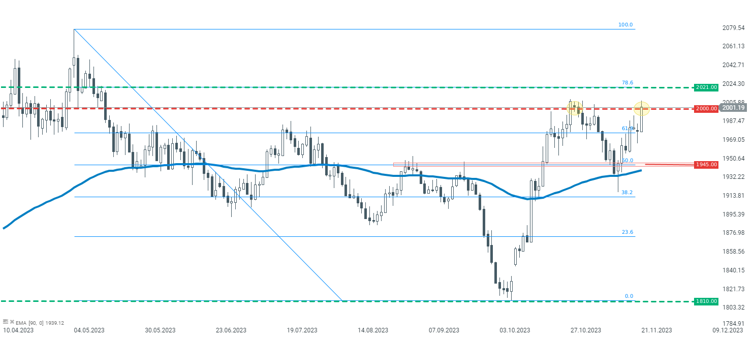 Las cotizaciones del oro aprovecharon la reciente debilidad del dólar estadounidense y subieron por encima de la barrera de los 2.000 dólares. Sin embargo, cabe señalar que el área alrededor de este nivel redondo fue una resistencia clave, desde donde comenzó una fuerte corrección a la baja a finales de octubre, alcanzando casi los 100 dólares. Si la historia se repitiera, el rango potencial para un retroceso estaría alrededor del nivel de $1945, donde se encuentran las reacciones de precios anteriores y el promedio EMA100. Por otro lado, en caso de una ruptura sostenida del nivel de 2.000 dólares, los aumentos podrían alcanzar una resistencia en 2021 dólares. Este lugar se debe a la ubicación del retroceso de Fibonacci del 78,6% de toda la onda descendente contando desde los maximos de mayo de este año.